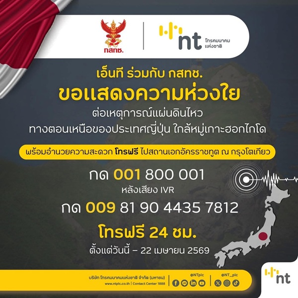 NT ขอแสดงความห่วงใยต่อเหตุการณ์แผ่นดินไหว ทางตอนเหนือของประเทศญี่ปุ่น ใกล้หมู่เกาะฮอกไกโด 📲...